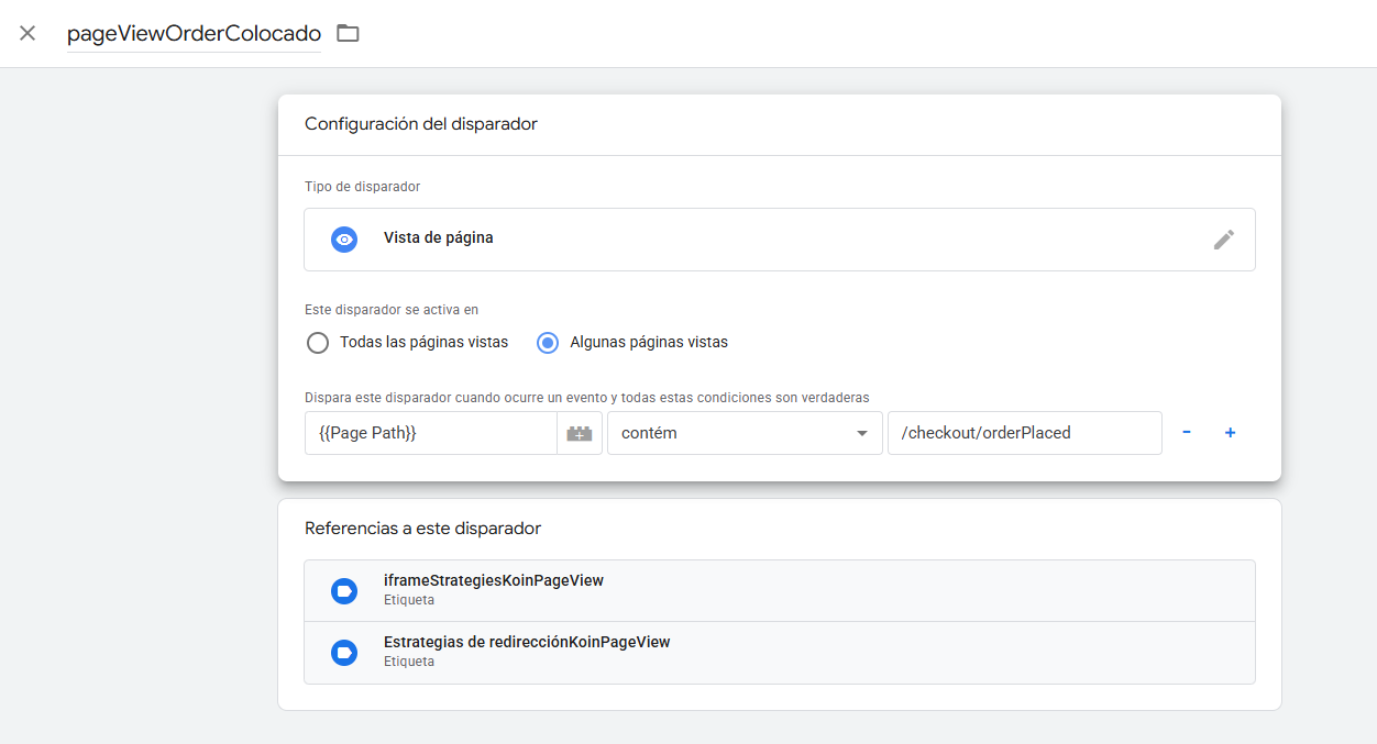 • Condición: Page Path → contiene → /checkout/orderPlaced