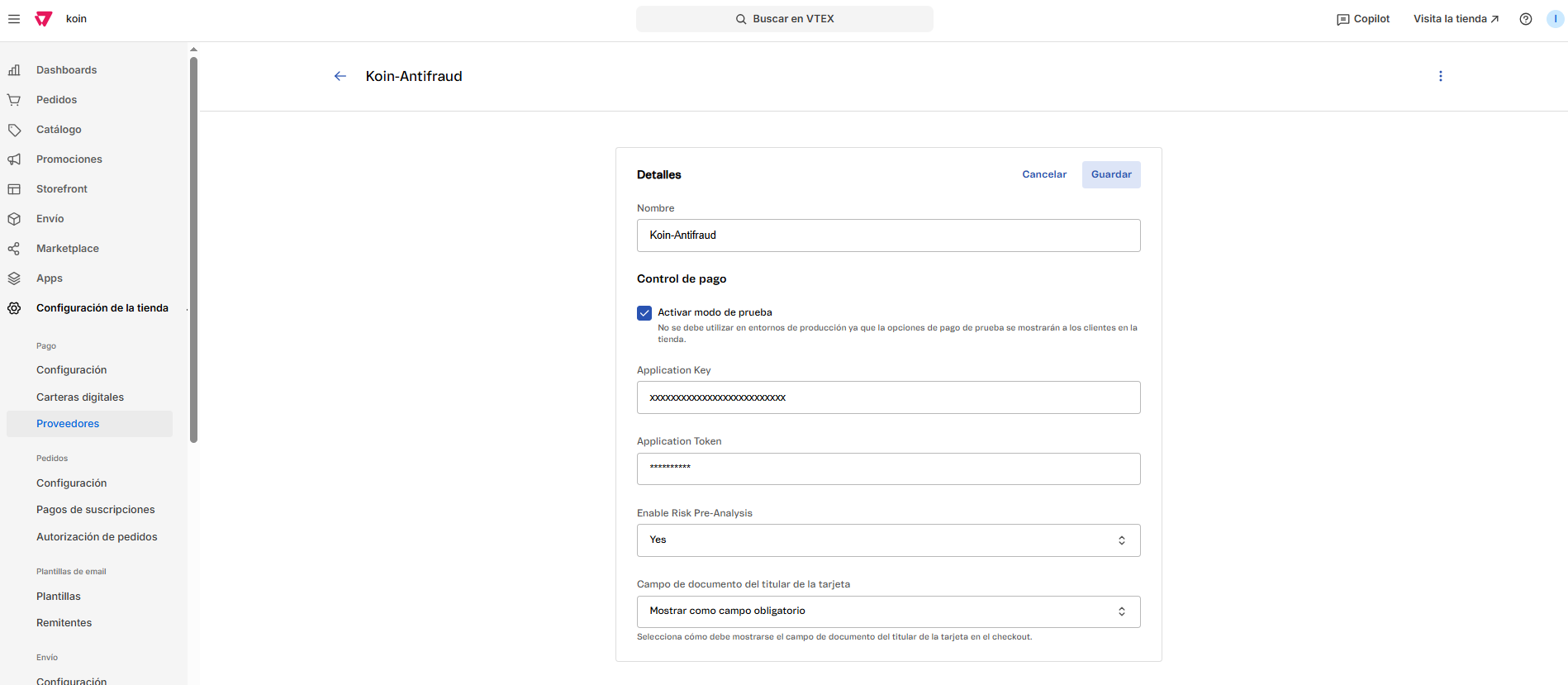 El proveedor antifraude Koin debe ser utilizado únicamente en los casos en que la tienda contrató exclusivamente el servicio de antifraude de Koin, pero utiliza otros proveedores para el procesamiento de pagos.